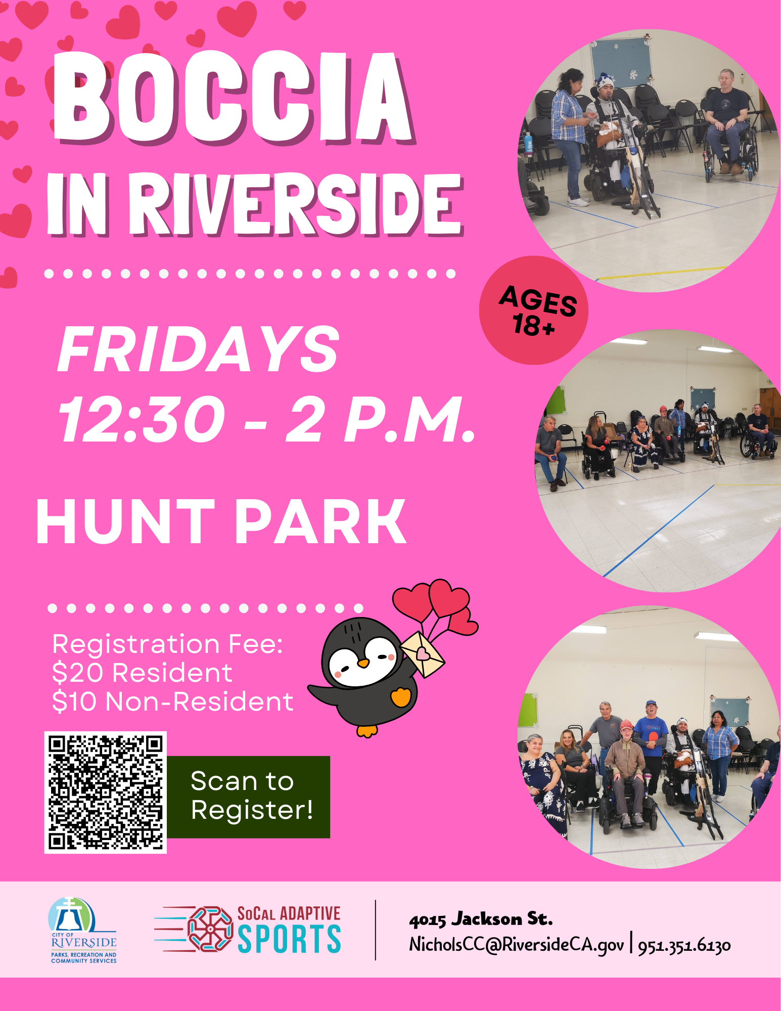 Riverside Adults Boccia Program February Friday, February 6, 2026 12:30 PM Friday, February 27, 2026 2:00 PM Hunt Park- Grand Ballroom 4015 Jackson Street Riverside, CA, 92503 United States (map) Google Calendar ICS Registration