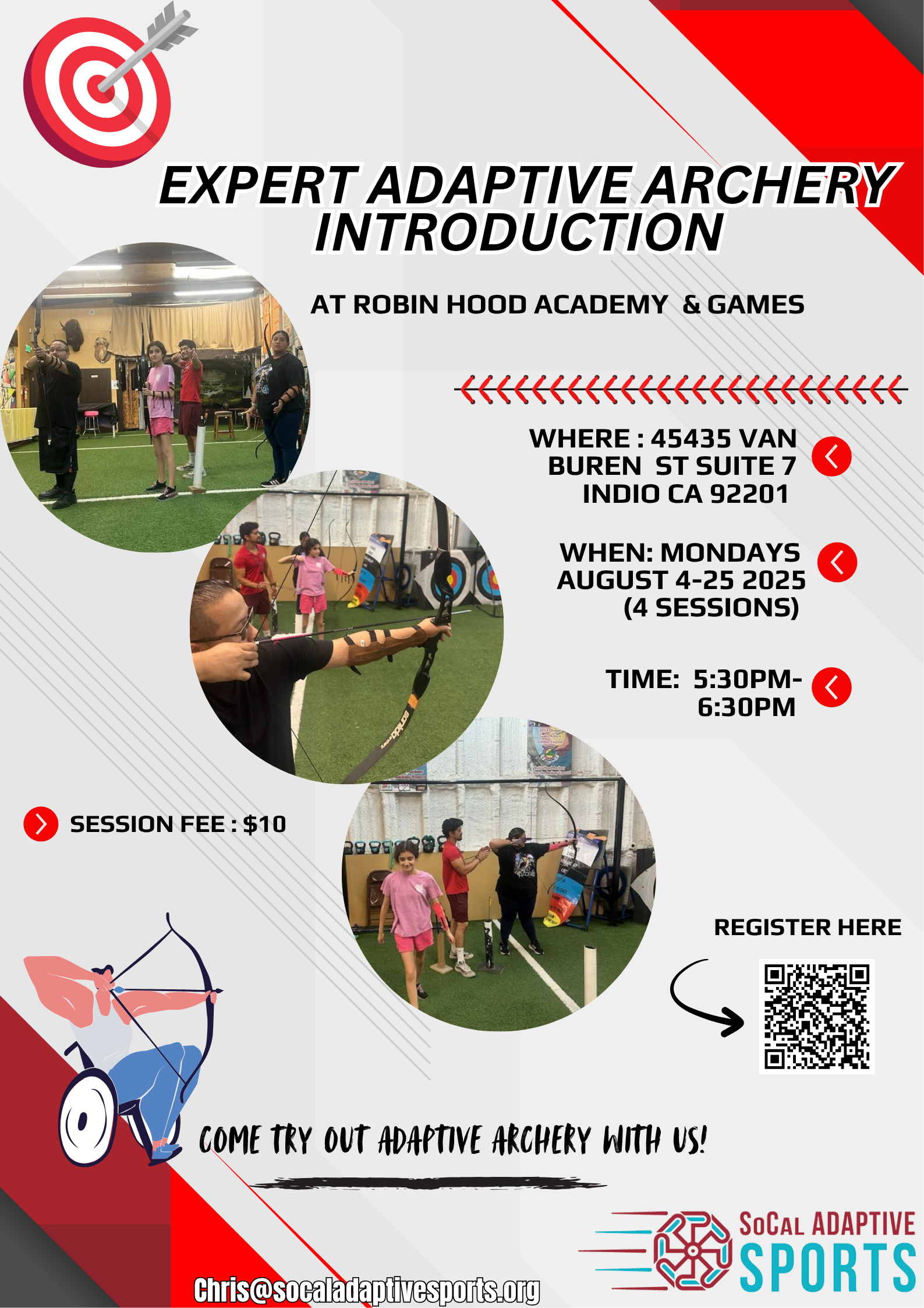 Adaptive archery every Monday August Monday, August 4, 2025 5:30 PM Monday, August 25, 2025 6:30 PM Robinhood Archery Academy & Games 45435 Van Buren Street Indio, CA, 92201 United States (map) Google Calendar ICS Register Registrate
