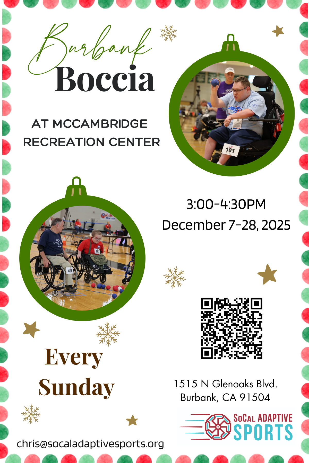 December Burbank Boccia Sunday, December 7, 2025 3:00 PM Sunday, December 28, 2025 4:00 PM McCambridge Recreation Center 1515 North Glenoaks Boulevard Burbank, CA, 91504 United States (map) Google Calendar ICS Boccia Registration B Active Card registrarse