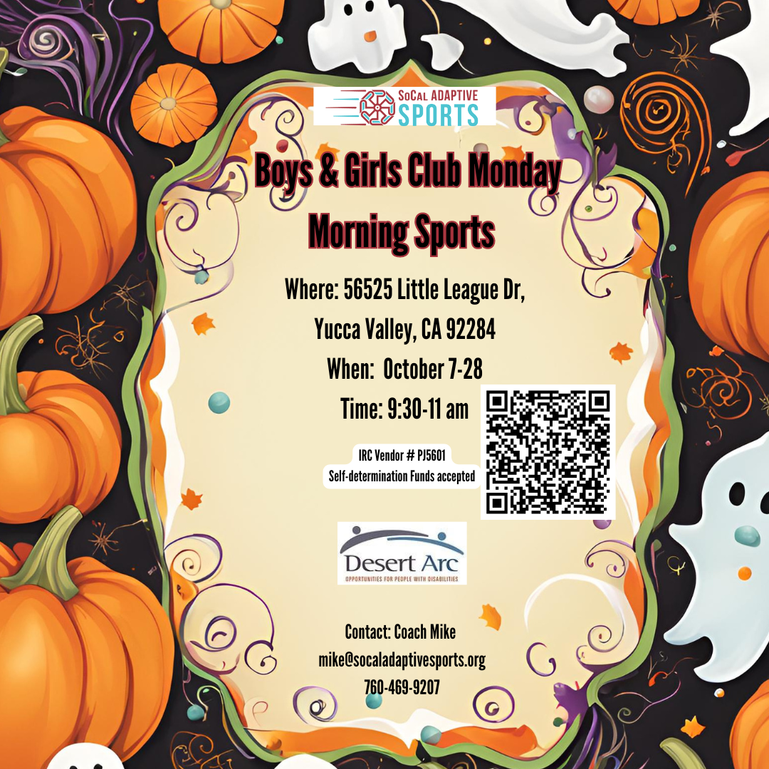 Back to All Events Boys and Girls Club Monday Morning Sports Monday, October 7, 2024 9:30 AM Monday, October 28, 2024 11:00 AM Boys and Girls Club Yucca Valley 56525 Little League Drive Yucca Valley, CA, 92284 United States (map) Google Calendar ICS Register registrate
